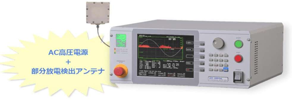 インバータモータの普及により、コイルの絶縁信頼性試験に必要とされる、部分放電試験をはじめ、家電製品や自動車製品、工業製品に用いられる、モータ、トランス、etc.のコイル絶縁試験として、AC耐圧試験と部分放電試験を同時に行い、専門的な知識がなくとも簡単な操作で高感度に良否判定を行い、試験時間の短縮及び試験装置のコストダウンが期待できる、画期的な試験装置です。